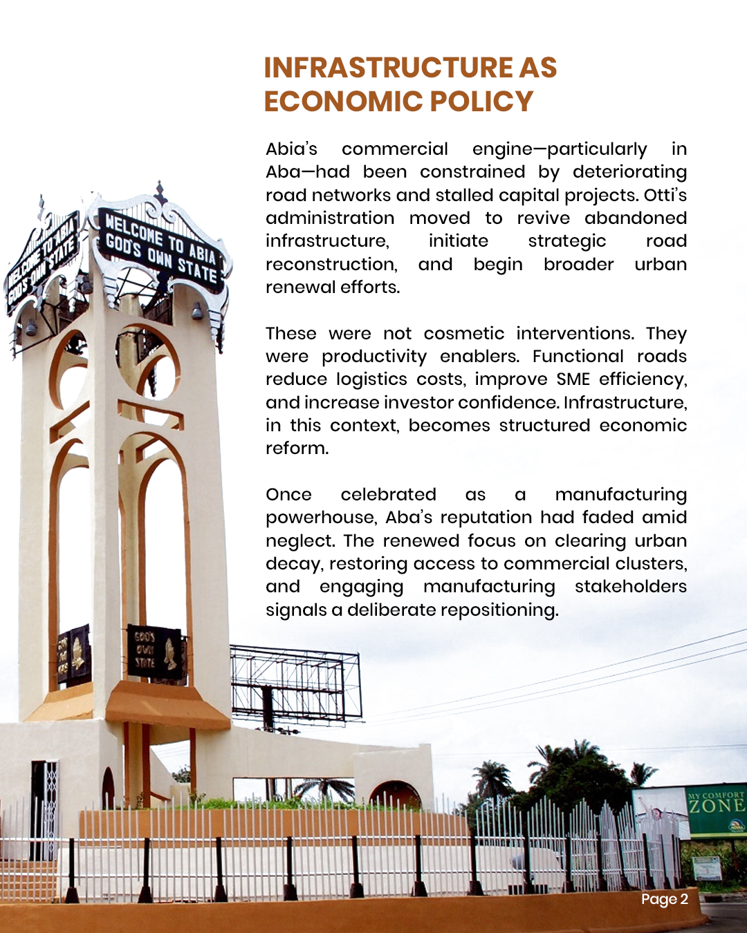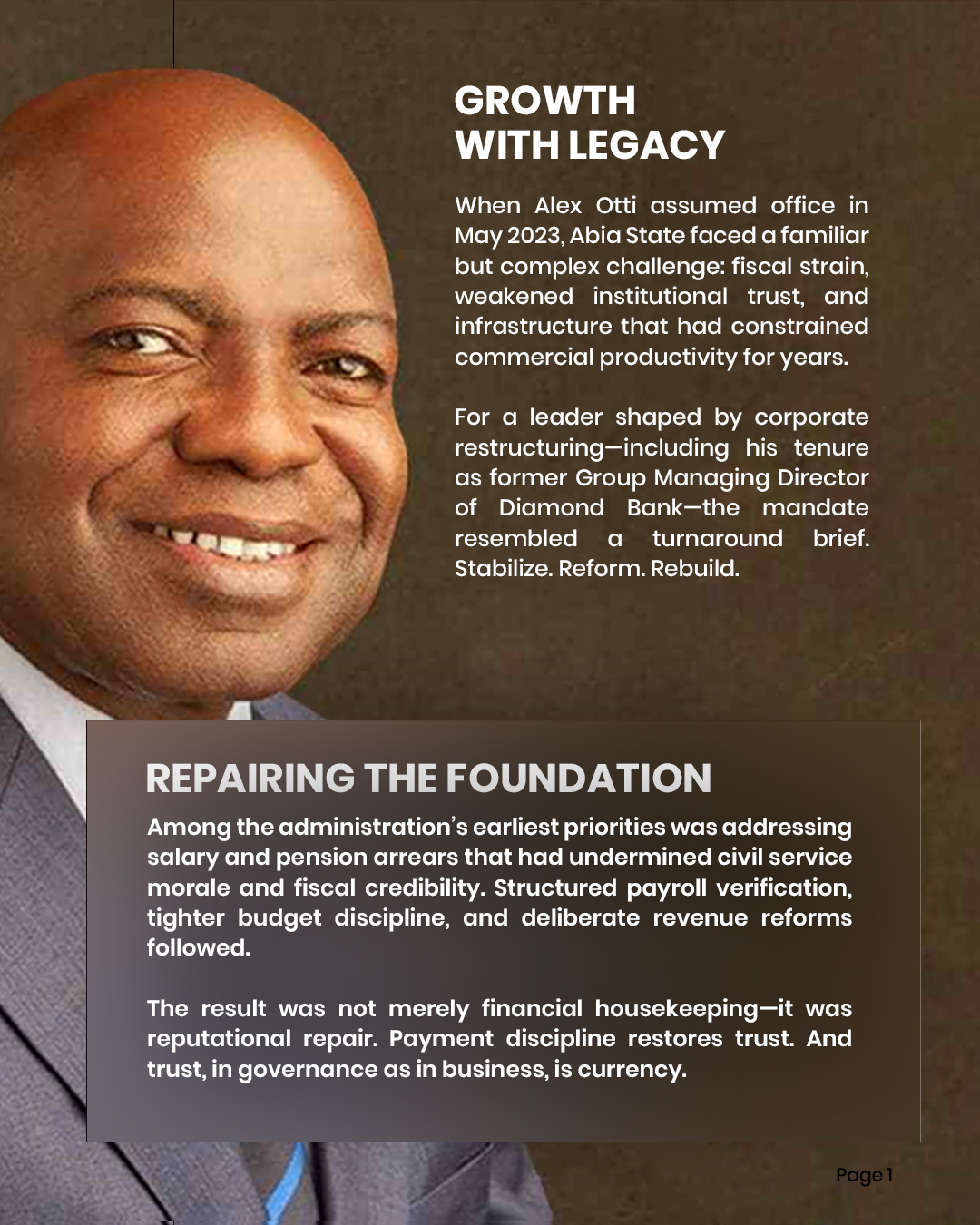 Alex Otti assumed office with a reform mandate centered on fiscal repair and institutional rebuilding. Leveraging his corporate background as former Group Managing Director of Diamond Bank, he prioritized clearing salary and pension arrears, tightening payroll controls, and restoring budget discipline. His administration has also advanced infrastructure renewalβ€”particularly in Abaβ€”positioning roads and urban rehabilitation as economic productivity tools rather than cosmetic projects. The governing logic is structured: stabilize finances, rebuild trust, and enable enterprise growth through disciplined systems.
