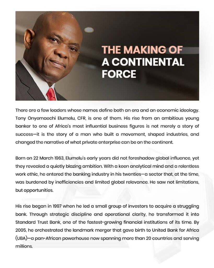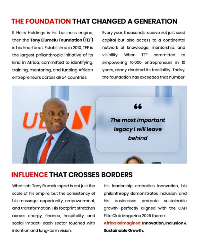 In this special GAH Elite Club Magazine feature, Tony O. Elumelu, CON β Chairman of Heirs Holdings, UBA, Transcorp, and Founder of the Tony Elumelu Foundation β is profiled as the man who transformed ambition into a continental blueprint.