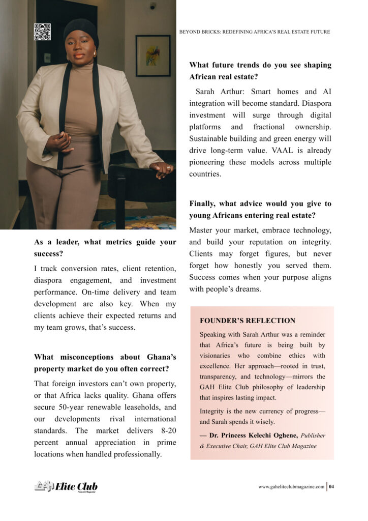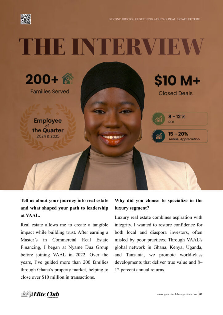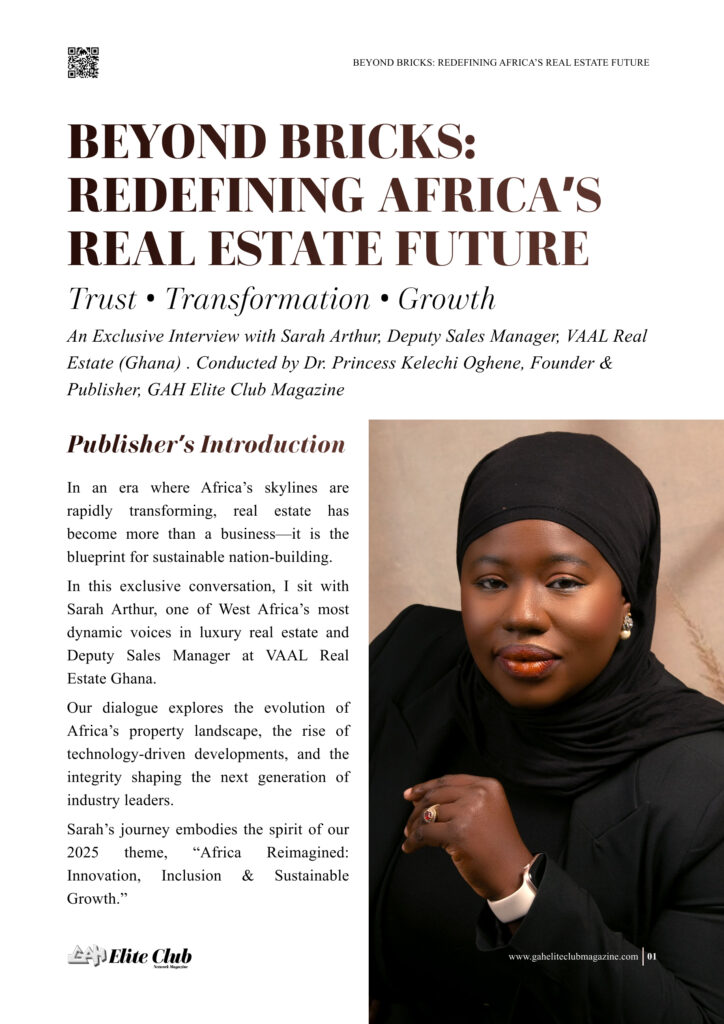 An Exclusive Interview with Sarah Arthur, Deputy Sales Manager, VAAL Real Estate (Ghana). Conducted by Dr. Princess Kelechi Oghene, Founder & Publisher, GAH Elite Club Magazine